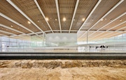 遺構を覆う、柱のないダイナミックな屋根が印象的なこの空間。遺構の高さまで階段を降り、間近に鑑賞することができるのも大きなポイントと言える。
