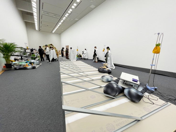 教習と称された音声に従い、参加者はロッカーに預けた荷物と引き換えにひとつの袋を手に入れる。袋には人がすっぽりと隠れるほど大きな白いマントが詰められており、鑑賞者はこのマントを身につけることで美術館という人工物に擬態しながら会場を巡ることとなる。美術館に来た鑑賞者が美術館のコスプレをする不可思議な状況が生じるのだ。