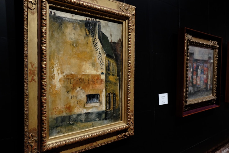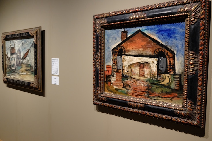 佐伯祐三は現在の大阪市北区中津出身。東京美術学校西洋画科卒業後の1923年に渡仏した。26年には一時帰国し、東京の下落合や大阪の滞船などに題材を求めるが、27年には再度パリに戻り、広告の文字を題材とした独自の線描による作風にたどり着く。しかし28年には体調が悪化し、同年8月に30歳の若さで世を去った。