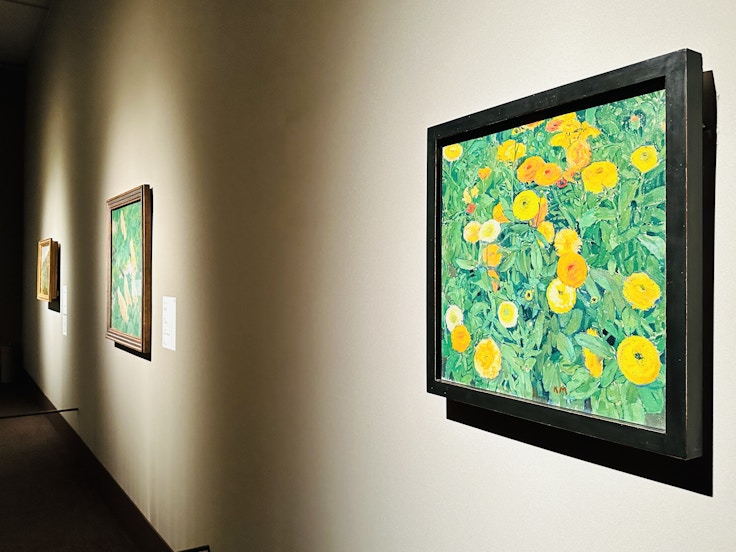 クリムトからの影響を受けた作品も見逃せない。《装飾的な背景の前に置かれた様式化された花》(1908)は、正方形のキャンバスの中央に大胆な色彩の花と葉が据えられたもの。このキャンバスの形や、背景に金や銀などを用いる手法はクリムトの影響を受けたもので、絵画の平面性を強調するとともに、装飾性も高められている。