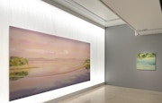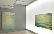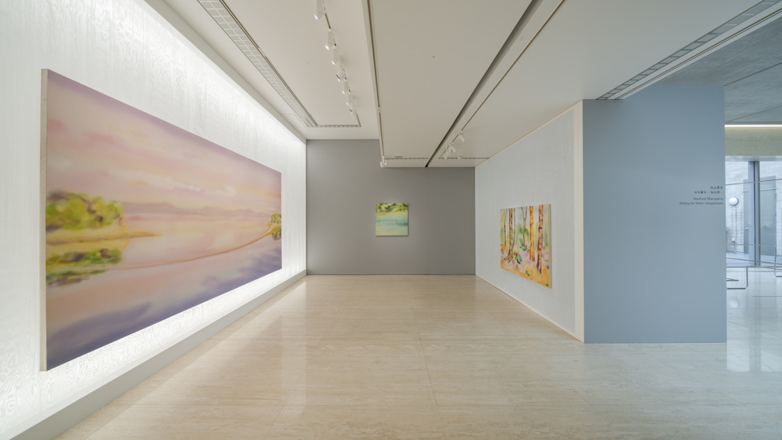 青木による会場構成も丸山の絵画からインスピレーションを得て、重ね合わせた布によるモアレを水面に見立てたかたちでデザインされている。青木が語る「湿気を帯びた仙石原の空気が感じられるような」空間の一部の壁面は、薄い半透明のヴェールに覆われており、空気のなかにある水蒸気の粒子が光に照らされて輝き揺らぐような感覚が生まれ、同時に絶えず変化する水面のようなすこしの不安定感も感じさせる。