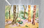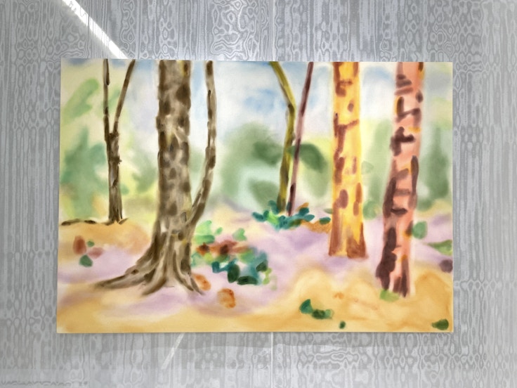 また、仙石原の森を主題にした新作では、赤褐色の幹肌が特徴的なヒメシャラの木々が描かれている。湿潤な土壌でしか育たないというヒメシャラの木や、太古の時代にカルデラ湖の底にあった湿地帯である仙石原の地も、水を扱う丸山の独特な表現手法と響き合っている。