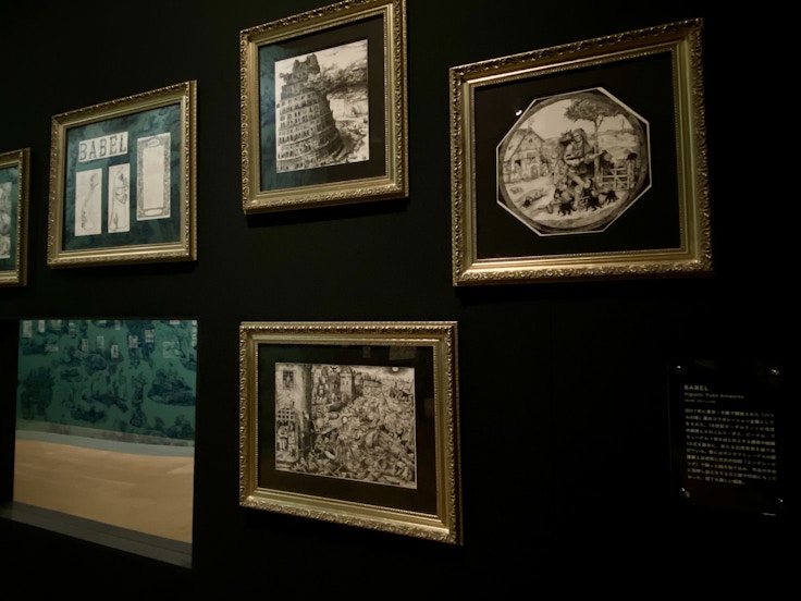 最初の角を曲がった先には、「バベルの塔」のオマージュでもある作品群《BABEL》の原画が展示されている。荘厳な額に入った一枚一枚は、幻想的な風景でありながらも歴史を切り取ったかのように静かで精密だ。