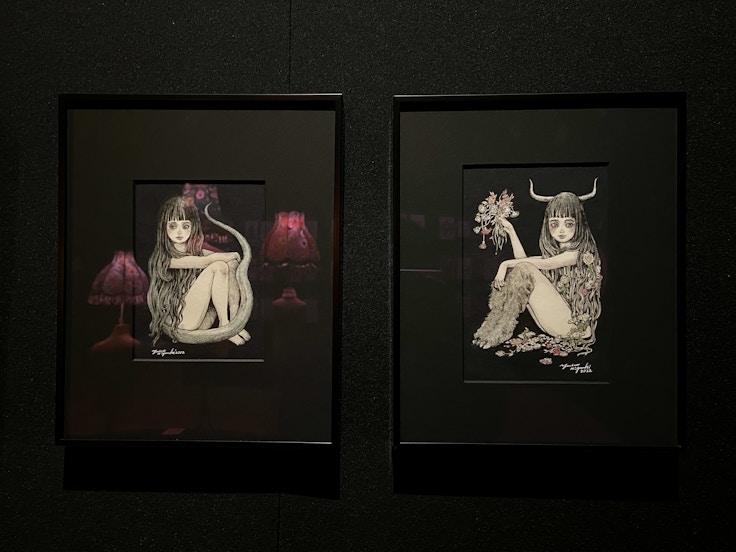 入口の赤い幕をくぐった先は暗く、黒い壁にはヒグチユウコの描いた絵が所狭しと飾られている。着彩された作品が多く、その一点一点が明かりを灯しているようにも感じられるだろう。