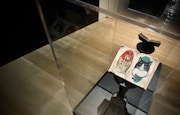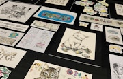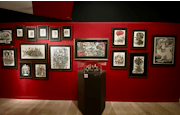 続く部屋には、巨大なショーケース。そのなかに着彩イラストや4コマ漫画、ホルベインとのコラボレーショングッズなどが整然と並べられている。壁にも八角形の額に入れられた絵が飾られており、なかには12星座をモチーフにしたイラストもあるので、ご自身のものを探してみるのもひとつの楽しみになるかもしれない。