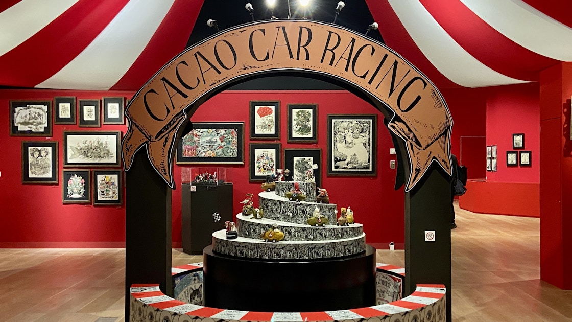 「イーブイ」達の横に伸びている赤い幕を抜けたなら、今度こそ賑やかなサーカスの世界。ヒグチユウコが背景を手掛けた『カカオカー・レーシング』の立体展示がこの空間の支柱になっている。そこでは、『ヒグチユウコ画集 CIRCUS』でお馴染みのイラストたちはもちろん、絵から飛び出してきたようなぬいぐるみとも随所で目が合うはずだ。