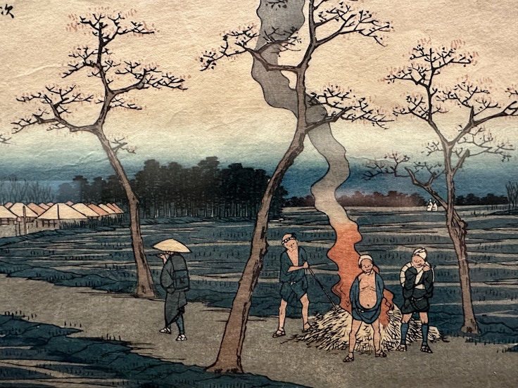 また渡邉は、広重の特徴として「風景に馴染んだ人物」が描かれている点を挙げる。広重は高い画力も持ち合わせていたが、風景画ではあえて登場人物たちをデフォルメさせている。そうすることで、風景と人物が絶妙なバランスでブレンドされのだ。またスナップ写真のような構成も、そうしたバランス感覚が優れていたからこそ成し得たものではないだろうか。
