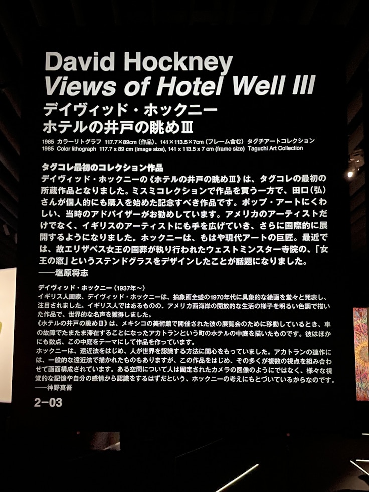 会場は通常の「ホワイトキューブ」のような空間でなく、黒いスペースがつくられている。また、本展のディレクターによる解説文や、田口弘・美和、そして同コレクションの形成に携わっているアートアドバイザー・塩原将志が書いた各作品にまつわるエピソードなど大量のテキストが、作品とともに紹介されていることも特徴だ。