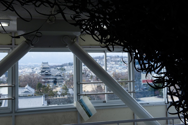 マツモト建築芸術祭は各会場の距離が近く、展示間を移動しやすいのも特徴のひとつだ。歩いて3分ほどで次の会場、松本市役所へ。松本城を一望できる市役所の展望室。階段を登り向かうなか、天井に現れるのが中島のインスタレーション《bane tree》。「悩みの木」を意味する本作。よくない状況を変えるために考えるときに人は悩む。悩みはマイナスな状況からポジティブへと向かう第一歩ととらえた中島は、マンガやアニメなどで悩みを表すクシャクシャとした表現を、黒い梱包用テープを駆使した空間作品として展示。窓外の松本城の黒とインスタレーションの黒い素材がシンクロする。