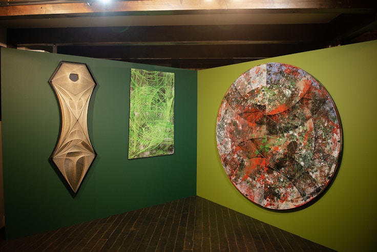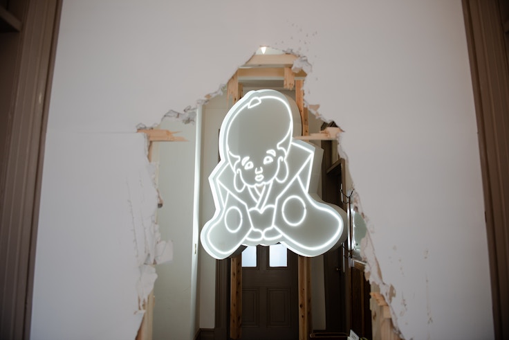 前回も参加した鬼頭健吾が展示を行うのは、大正時代に建てられた旧小穴家住宅。2020年より空き家となっていたこの建物。ハウスメーカーに売却予定だったところを、建物の保存利用を強く望む若い弁護士の所有となり、2022年に国登録有形文化財に指定され保存されることが決まった。「絵画」から派生し、フラフープなどを用いて空間にも表現を展開する鬼頭は、円形のLEDライトをキャンバスに組み合わせた作品を和室に、透過性のある電飾看板に着彩した作品を裏手のガレージに展示した。