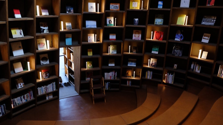谷筋を進んでいくと、半円状につくられたガラス張りの建物が現れ、天井までの本棚が来場者を迎える。梁や柱といった建築的な要素は極力排除されており、土地の傾斜に応じて天井高が決まったことから、様々なサイズの小さな隠れ部屋が本棚のあいだにつくられ、思い思いの場所で読書に没頭できる設計だ。