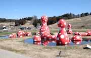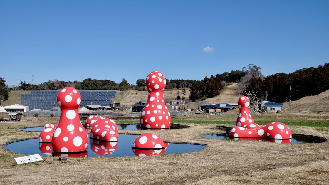 もうひとつの草間作品《新たなる空間への道標》(2016)は、広大な畑を背景に展示されている。開けた視界の中に現れる、誰もが草間作品とわかる赤と白の水玉の彫刻は、見るものに強いインパクトを与えるはずだ。