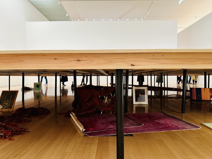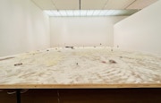 展示室いっぱいに広がった巨大な舞台のようなもの。その名も《大きいテーブル(丘)》は展示冒頭の《CAT Carving(猫彫刻)》と同じく、落合多武によるものだ。極端に巨大なテーブルの上にはドローイングやオブジェなど様々な要素が点在している。しかしここで視点をずらしてみよう。ねこのようにテーブルの下を覗けば、そこにはまったく違う世界が広がっている。