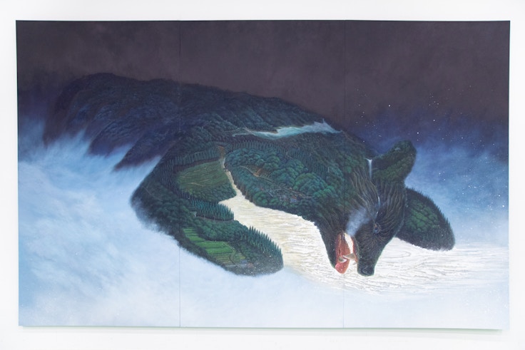 VOCA賞を受賞した秋田出身の永沢碧衣による《山衣(やまごろも)をほどく》は、秋田のマタギにとって神聖な動物でありながらも捕獲駆除の対象ともなっているツキノワグマを描いた作品だ。自らも狩猟者として山で狩り、そのいのちを膠として作品制作に生かすことで、人間と自然の関係を丁寧に描き出している。受賞インタビューはこちら。