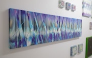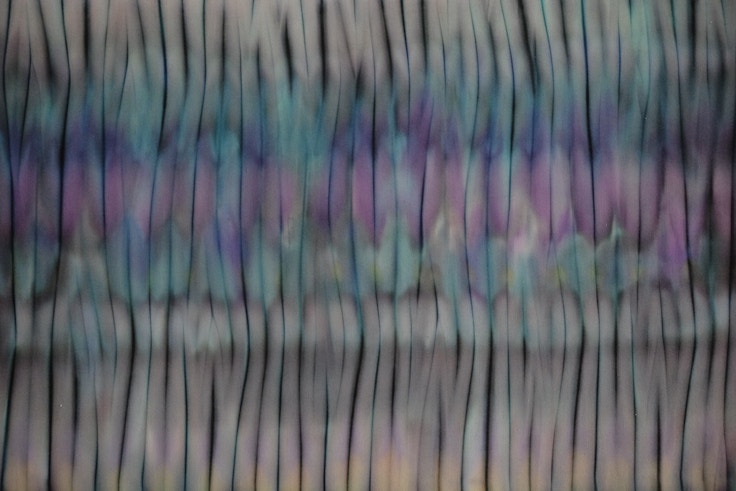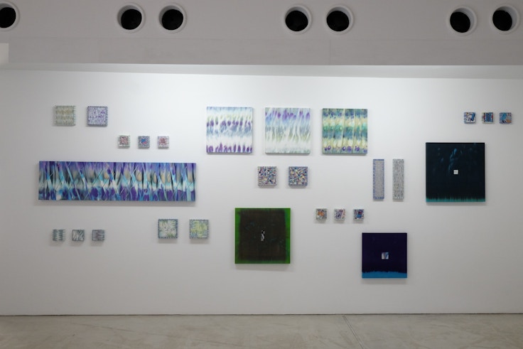 福本繁樹の作品は自然光が入るギャラリーBで展示されている。福本繁樹は「なるほど染め」と自ら名づけた、染料の動きをとらえる独自の試みを行ってきた。油彩を重ねたかのような奥行きを持つ、まるでいまも流動しているかのような波形を感じるその独特の染めは、見るものの目を奪う。