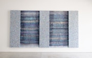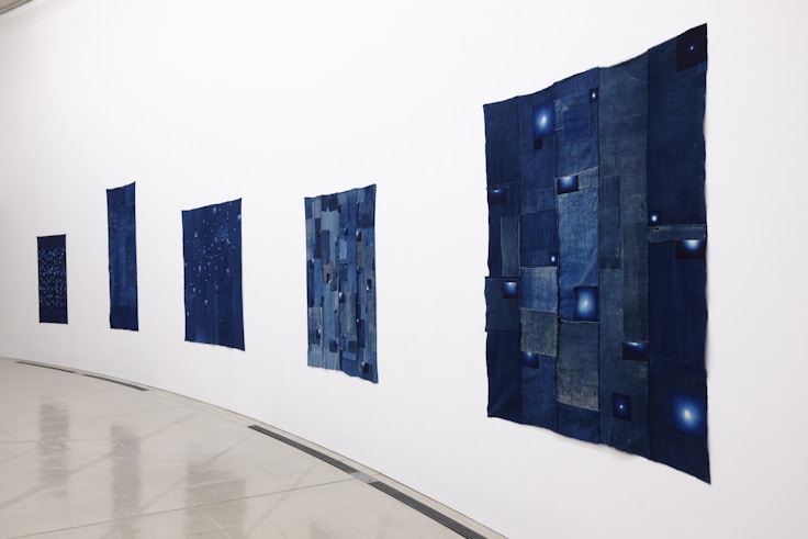 福本潮子の作品で目を引くのは、光源のように白く輝く一点絞りだ。近年の代表作となる「銀河」シリーズは、中国のトルファンで制作される綿布を重ねて絞ることで生み出したこの絞りを、藍染めの木綿布をつぎはぎし、生活のなかで使用されてきた「ボロ」にコラージュしたもの。とくに、会期中の青森上級で見られる星空を写した《北斗》は、これまでの福本潮子の探求の通過点にこの青森があることを物語っている。