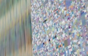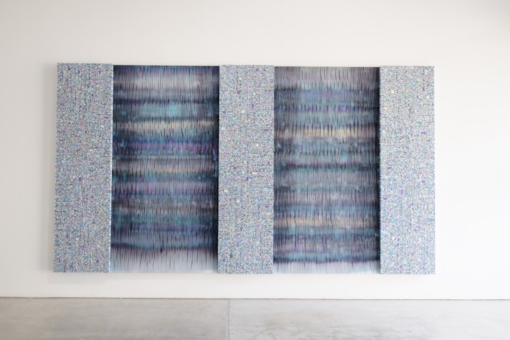 本展で展示された新作《すっちゃんちゃがら》《ちゃんちゃがら》は、このダイナミックな「なるほど染め」と緻密な「布象嵌」を組み合わせた作品だ。「布象嵌」は、「なるほど染め」により生まれた布を和紙で裏打ちして切り刻み、それを隙間なく貼り合わせて再構成するという、福本繁樹が30年以上続けてきた技法となる。