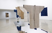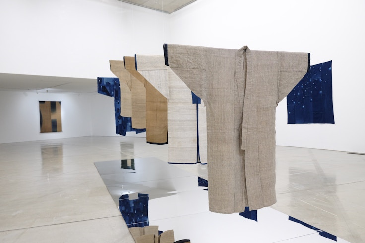 また、福本潮子は古布とも向き合ってきた作家だ。大麻、紙布、藤布、科布、オヒョウといった素材を使った自然布は、日本全国で使われ、仕事着などとして残されてきた。この布を解いたうえで、福本は最小限の染めを施している。現代の布と比べると、驚くほどよく染まるというこの古布との対話が、染色という行為を通して現出している。