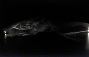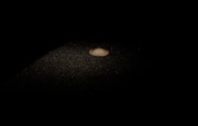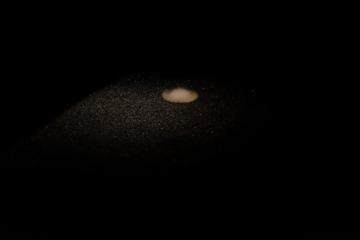 照明のない暗がりの展示室には、《sink》(2023)が展示されている。天井には明かりに照らされた穴が空いており、ここから光の玉が静かに落ちてきては煙となって消えていく。地面に敷き詰められているのは、リサイクル施設で廃棄物を高温で処理した際に発生した「スラグ」だ。人類の日々の営みが蓄積したともいえるこの「スラグ」に向かって、生まれた光の玉が落ちて消えていくその様は、大巻が青森でたどり着いた死生観を表現したものと言えるだろう。