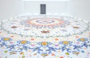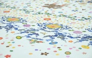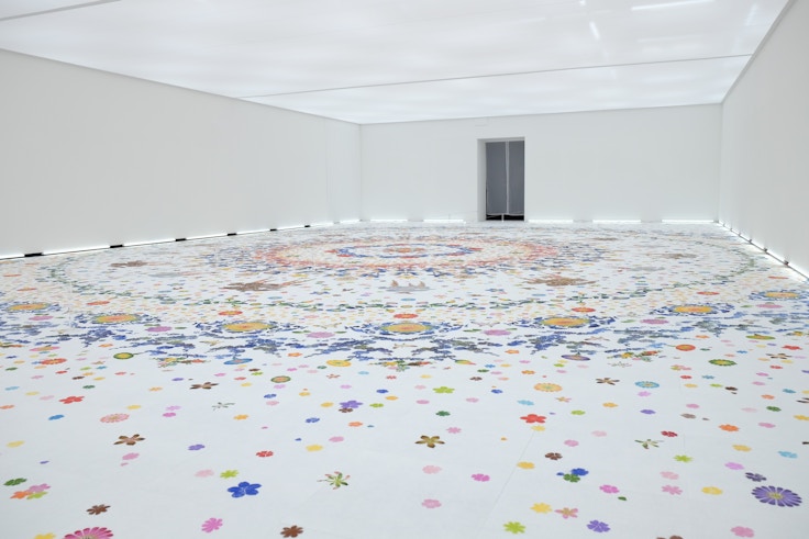 《Echoes Infinity -trail-》(2023)は市民が制作に協力した作品で、花々を岩絵具で床一面に描いたもの。まるで極楽浄土のようなこの明るい部屋の中央を歩くことで、展覧会の幕が閉じていく。