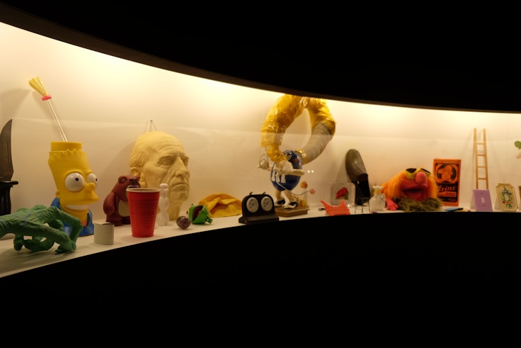 内部に足を踏み入れるとガラスケースがあり、その中には誰もが見たことのあるキャラクターの人形や、日常目にする道具などが並んでいる。本展で上映された映像作品に登場するものも多く含まれており、それらをダ・コルテの映像の断片としてケースの中で展示することで、その記号性が強調されている。