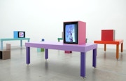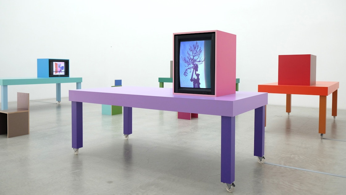 約12メートルの高さの壁と、天井からの採光が特徴的な展示室8。カラフルな什器と組み合わされた5つのブラウン管モニターが、自然光に照らされながらダ・コルテのこれまでの映像作品を上映している。過去20年間にわたり手がけてきた映像作品のなかから、選りすぐりを集めたというこの展示。「腰を据えてじっくりと鑑賞してほしい」とダ・コルテは語る。