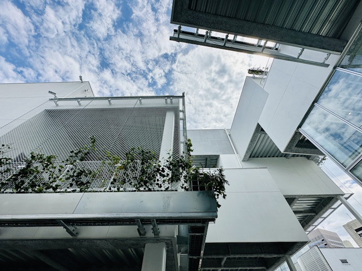 敷地面積は1241平米、延床面積は2018平米。建築設計は太田市美術館・図書館などで知られる株式会社平田晃久建築設計事務所によるものだ。中庭を囲むようにギャラリーや住居が広がるこの施設。平田は設計にあたり、「街の中で拠点となるような場所をどうすればつくれるのかという問いかけから始まった。大きな樹冠のように緑化されたボリュームを浮かべ、1本の樹の下に人々が集まるように、人々の自由な活動で満ちた場所をつくりたいと考えた」と語る。建築は街に開かれており、光と風が抜ける、まるで広場のような空間だ。