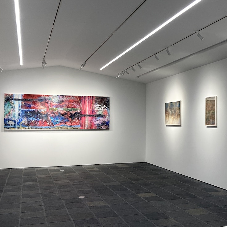なお、同エリアのMtK Contemporary Artでは、個展「I'm nobody. 何者でもない」が6月28日まで開催中。ここではパフォーマンスと展覧会の接続が実現しており、『NOBODY』を書で綴った西陣の絵巻物や、能面も鑑賞できる。極地という意味を持つドローイングの「polar」シリーズでは、帯の織り糸の元である焼き箔を貼った上に、オイルパステルで描いたことで生まれる、内側と外側がわからなくなるような絶妙な質感を楽しめるだろう。会場奥にはさらに、2021年にデジタルアートとして公開された《OUR NEW WORLD》の原画を複写して転写した上にペイントと糸やビーズを使った、3メートルにも及ぶ刺繍作品も展覧されている。