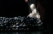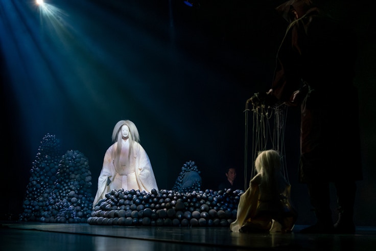 開演後、モノクロームな舞台にまず上がったのはシテではなく、『一糸座』四代目結城一糸が操る人形だった。白髪に白い装束を纏った人形と並ぶと、バルーンでできた岩は恐山のような風格を醸し出し、彷徨い果てて井戸に行き着くまでの長い道のりの表現を可能にしている。