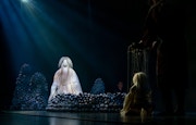 開演前の薄暗闇でも、舞台の中央に石造りの井戸、奥には岩のような舞台セットが確認できる。清川監修のもと舞台美術を手掛けたDAISY BALLOONは、バルーンアーティストユニットだというから驚きだ。風船のイメージとはかけ離れた微細な凹凸を持つ固そうな質感は、わざと萎ませることによって実現しているのだそう。今回のために組まれた、清川が客員教授を務める大阪芸術大学美術学科 ASAMI LABOメンバーも助っ人として一緒に舞台をつくり上げたとのこと。