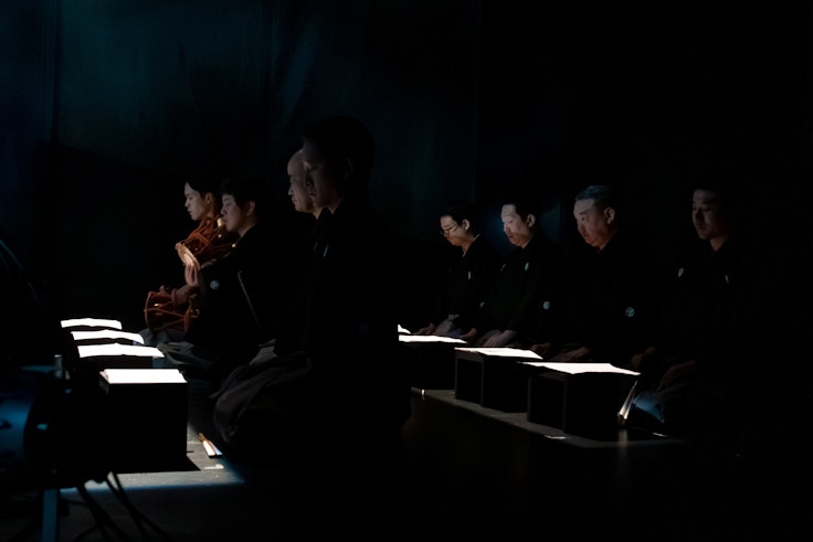 同時に、囃子も存在感を増していく。一般的な能の会場とは材質もつくりも異なるため、音響については難点があるのではないかと危惧されたが、現代音楽との組み合わせによって見事にカバーされている。おどろおどろしさも内包する環境音楽を手がけたのは、ミュージシャンの原摩利彦。どこの空間かわからないような原の音楽がベースとなり、その合間や、時に覆いかぶさるようにしながら笛、小鼓(こつづみ)、大鼓(おおつづみ)、太鼓の音が、息遣いとともに観客に伝わってくるのだ。