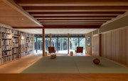 図書室「鈍考」は90分ごとの入れ替え制で、一度に入室できる定員は6名。予約はウェブで行い、入室日時が確定すると、入室のための扉の暗証番号がメールで送られてくるシステムになっている。大谷石が階段状に敷かれたアプローチを上り、エントランスの扉を開けると、真っ先に視界に入ってくるのは裏庭のヒノキ林を借景に切り取ったピクチャーフレームのような開口部。耳に入ってくるのは庭の傾斜した河岸の下を流れる小川のせせらぎと鳥のさえずりぐらい。たまに顔を覗かせる鹿には敏感になりながら、「時間の流れの遅い場所」をつくりたかったと幅が言うように、ここでは時間の世界にいることを忘れそうだ。ここは、壁一面に配された書物の中から思い思いに選んだ一冊とじっくり向き合うための場所である。