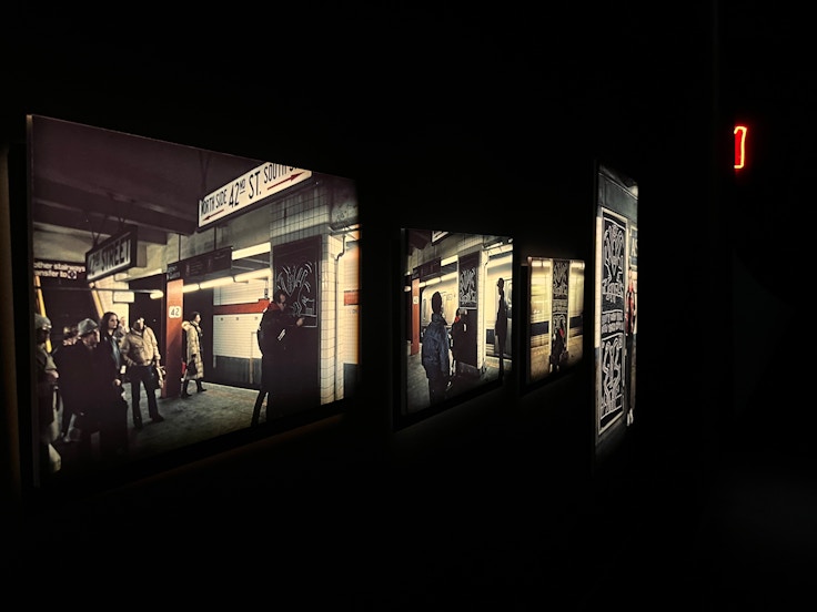 展示室に向かうスロープには、ヘリングがニューヨークの地下鉄の駅にある空き広告のスペースにチョークでグラフィティを描いた「サブウェイ・ドローイング」の記録写真が並ぶ。ペンシルヴァニアから大都会・ニューヨークに出てきたヘリングが、街にあふれるグラフィティに衝撃を受けて制作を始めた、当時のニューヨークの空気感が伝わってくる。