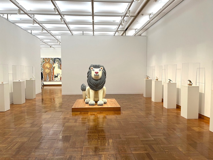 8階ロビーから展示室に入ると、まずは「ANIMALS」シリーズの《ライオン(白)》(2016)が来場者を迎える。ブロンズ製でありながらも表面の表情豊かな油彩の質感は、同じ空間に展示されている油彩画の《ライオン》(2018)と見比べることで、三沢の彫刻における色彩へのこだわりをより深く理解できるだろう。