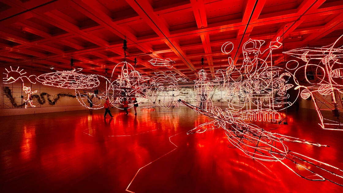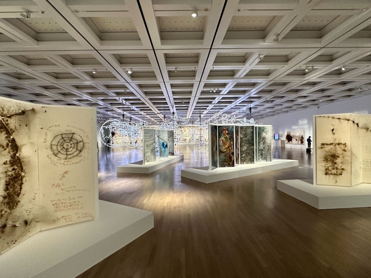 展覧会は4章構成。作家として歩み始めた中国時代の作品が並ぶ第1章「〈原初火球〉以前一何がビックバンを生んだのか? 」から、芸術家としての重要な形成期である日本時代を紹介する第2章「ビッグバン:〈原初火球:The Project for Projects〉1991年2月26日〜4月20日」、そしてアメリカや世界を舞台に活躍を見せる第3章「〈原初火球〉以後」と第4章「〈原初火球〉の精神はいまだ現在か?」へと緩やかな時系列で展開されている。
