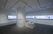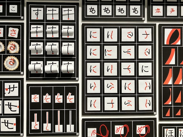 先月まで開催されていた個展「STUDY」では、「つくっている最中」にデザインの面白さを見出す岡崎の、「デザインと向き合うスタディの時間」が展示空間へと再現されていた。第1展示室で展開されたテレビ番組「デザインあ」でもおなじみのストップモーションアニメでは、「あ」の一文字と白い紙のみから様々なパターンの動きが生み出されていることがわかるだろう。
