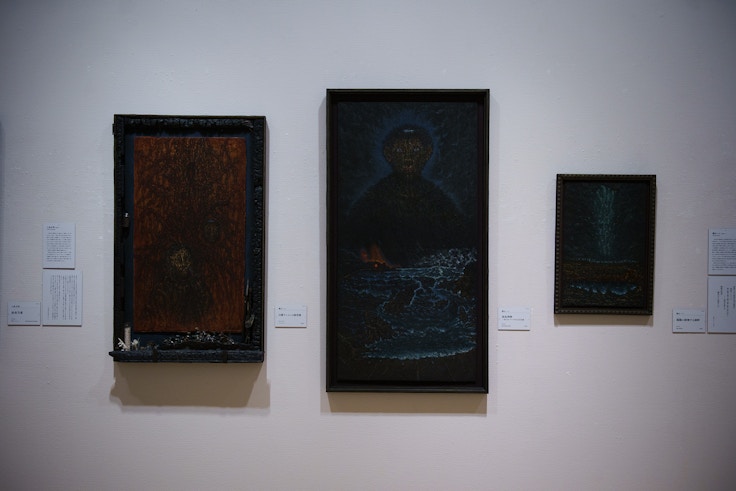 展示の章立ては緩くシームレスに続く。「神・仏・魔を描く」と題された章には、神仏の姿を感得し、形にした作家、仏師たちの作品が並び、そこには内面に反映された神や仏と同時に、得体の知れぬ「魔」の姿も現れている。自然信仰や神仏習合などの影響も受け、旅をしながら仏像を彫り続けた円空、台風で半倒壊した樹齢600年のご神木にスサノオを見出した三宅一樹といった作家による立体作品から、高島野十郎、藤井達吉、秦テルヲ、平野杏子、佐藤渓、若林奮などの平面作品が集められた。