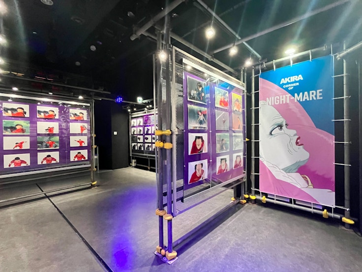 会場は「NEO TOKYO」「NIGHT-MARE」「CATASTROPHE」の全3部構成。「NEO TOKYO」では、物語の舞台となる「ネオ東京」の都市風景や登場人物の設定画から、作中序盤のセル画の数々、そして大友によるカラー原画までが展示されている。