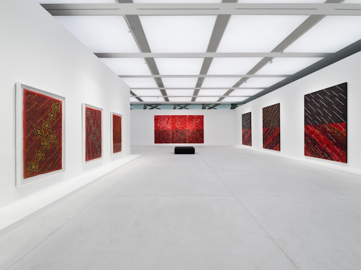 これらの新作は赤と黒を基調とし、それぞれの画面は「天と地」を示すように中央からふたつに分かれている。その意図についてディンはこう話す。「人類の歴史は何千年もあり、それは時間だけでなく、歴史のなかで起こった出来事も含んでいる。そのため、凝縮された濃密なイメージを通し、歴史のなかの血と肉、力、抵抗を表現したかったのだ」。画面中の「天と地」を貫く斜めの線も、すべてを超越した力を表現しており、平面のように見える絵の表面は、彫刻刀で刻まれたくぼみや、顔料が堆積してできた突起に満ちている。