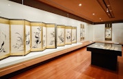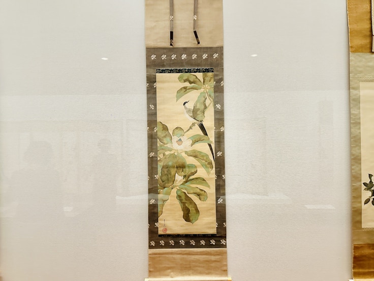 この若冲に加え、細見美術館のコレクションを象徴するのが琳派の作品だ。俵屋宗達から尾形光琳、酒井抱一、鈴木其一などの代表作家のみならず、江戸後期の中村芳中や明治期の神坂雪佳まで、約350年にわたる琳派の系譜を網羅したコレクション。本展では、酒井抱⼀の《⽩蓮図》(江⼾後期)が鎌倉時代の竹華籠とともにしつらえられているほか、朴の葉に「たらし込み」の技法を用いた鈴⽊其⼀の《朴に尾⻑⿃図》(江⼾後期)など、優品の数々に目を凝らしたい。