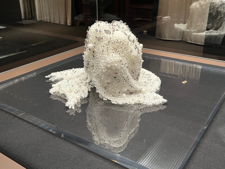 稲崎栄利子の《Euophoria》(2023)は、布のような素材に見えるが、じつは極小の細かい陶のリングを組み合わせてつくられた作品だ。陶という素材の可能性が広がっていく様を体感できる。