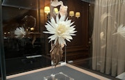 金属ではなく木彫による自在置物で生命力を感じさせる人体や昆虫、草花をつくりあげる大竹亮峯。花器に水を注ぐとゆっくりと花弁が開くという仕掛けを持つ《月光》(2020)は、動かずとも圧巻の迫力を感じさせてくれる。