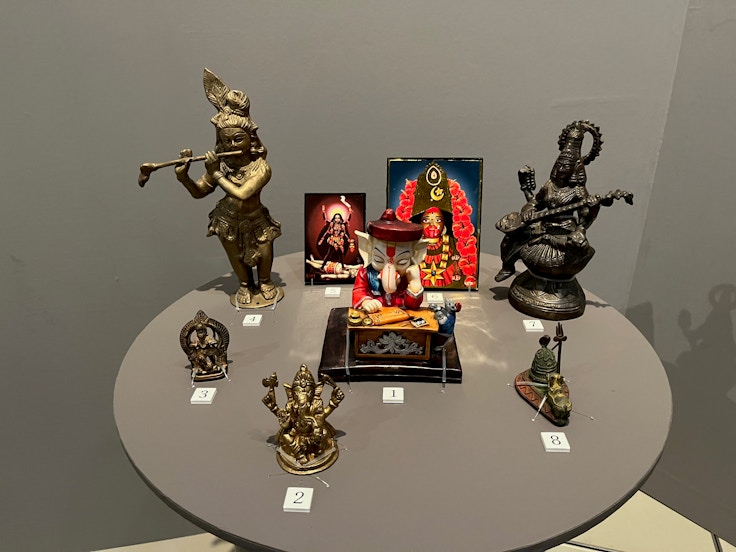 会場では、こうした神々を祀るために、ヒンドゥー教の各家庭に必ずある祭壇で使われる品々も紹介。神像のみならず音を出す楽器、清めるための聖水の器、崇拝対象に掲げる灯明台、香や供物の器など、目を引くものが数多く展示されている。
