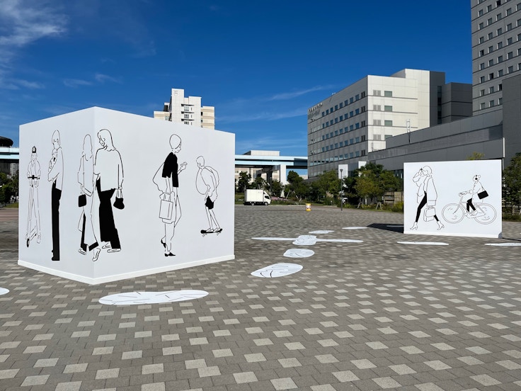 「Biotope Circles-生きるものたちの息づかいが聴こえる場所-」の会場である「石と光の広場」に隣接する「花の広場」では、長場雄が初のAR作品《Everyday Life》を展示。会場には長場のアイコニックな人物像が描かれた白いふたつのキューブが設置されているが、ここに向けてスマートフォンをかざし、アプリケーションを起動するとVR空間で長場のイラストが自在に動き出す。