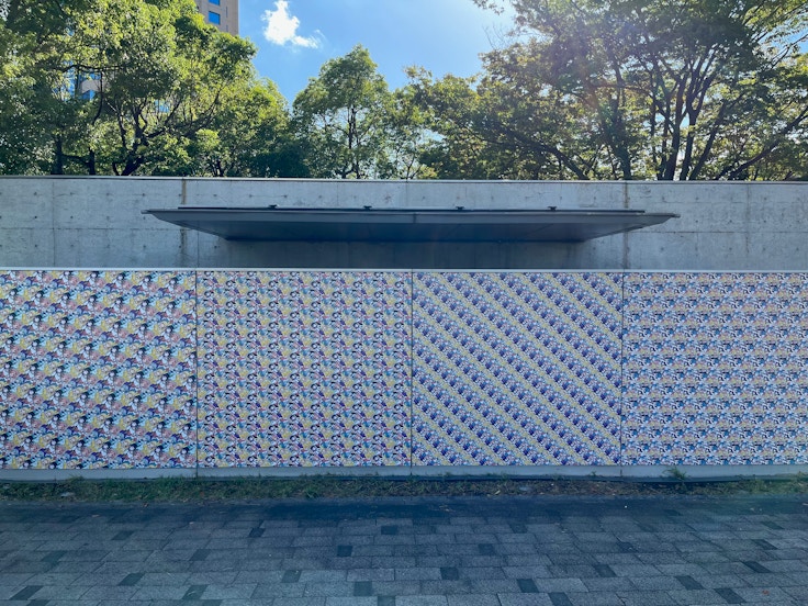 広場を後にし、お台場の中心部を東西に貫くシンボルプロムナード公園を青海方面に歩いていくと、テレビ朝日施設の建設予定地がある。ここの仮囲いと付近のトイレ壁面に新作を展開しているのがアルバムジャケットやキャラクターデザインを手がけるがーこだ。