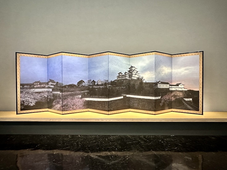 同作の両脇にも屏風作品が並ぶ。向かって左の《狩野永徳筆 安土城図屏風 想像屏風風姫路城図》は、22年の姫路展の際に制作されたもの。狩野永徳が描いた《安土城図屏風》を思い、安土城を想像しながら姫路城を撮影したという構造を持つ。その反対側には、「杉本博司ー春日神霊の御生(みあれ) 御蓋山そして江之浦」(春日大社、2022)で初披露された《春日大社藤棚図屏風》を見ることができる。