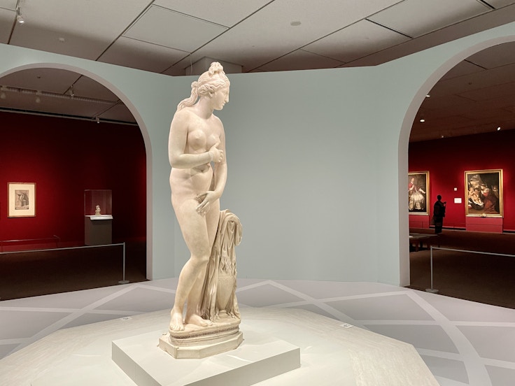 同作は、1752年に教皇ベネディクトゥス14世によってカピトリーノ美術館に寄贈され、1779年にナポレオン指揮下のフランス軍によって接収。ナポレオン敗北後、1816年にローマへ返還され、1834年以降はカピトリーノ美術館の「ヴィーナスの間」と呼ばれる八角形の展示室に置かれている。本展では、この作品がカピトリーノ美術館の展示室の形にした特別空間で展示されており、床も同館が位置する、ミケランジェロによって設計されたカンピドリオ広場の模様で飾られている。