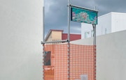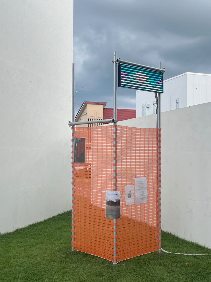 美術館の屋外スペース「アート広場」にも作品が展示されている。戯曲の一節が流れる電光掲示板、写真、蛍光色のネットを組み合わせたこのインスタレーションは、フィクションと現実のあわいを感じられる場所だ。