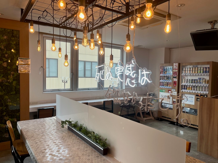街に向かって作品を開いていく三野の姿勢は、他会場の作品からも感じることができる。三野はビジネスホテルである「スーパーホテル十和田天然温泉」の朝食会場で、映像作品や写真、ネオン管による空間を構成した。戯曲に登場するホテルという存在が、実際のホテルの内部に侵入しているともいえるこの試みは、セーフスペースの内側と外側についての思考を喚起させる。
