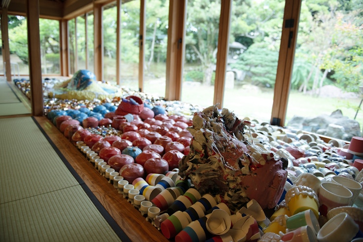 おもに陶芸作品を集めた樂翠亭美術館が、3エリアのうち富山駅から最寄りの環水公園エリアのチケット販売・確認会場。辻村塊の作品を皮切りに、桑田卓郎ら6名の作品が来場者を迎える。2011年の震災を契機に自然を操作することの不可能性を感じ、鎮魂の念を自身の身体で表現する「坐像」シリーズを開始した近藤高弘、公共工事で生まれた残土を素材とし、生命に不可欠である摂取と排せつを想起させる「営み」そのものを作品化する野村由香など、素材を共通としながらも表現は多彩だ。